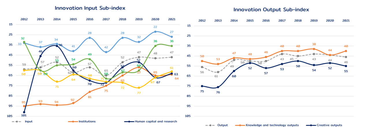 ผลการจัดอันดับความสามารถทางด้านนวัตกรรม (GII) ในปี 2022 ประเทศไทยอยู่อันดับที่ 43 ปรับเพิ่มขึ้น 1 อันดับ จากปี 2020 โดยในช่วง 10 ปีที่ผ่านมาอันดับดัชนี GII ในภาพรวมยังเกาะกลุ่มอยู่ในระดับดีปานกลางปรับตัวดีขึ้นเล็กน้อย ซึ่งในปี 2021 ปัจจัยเข้าทางนวัตกรรม (Innovation input sub-index) ปรับเพิ่มขึ้นจากเดิมอันดับที่ 48 เป็นอันดับที่ 47 ขณะที่ปัจจัยย่อย ผลผลิตทางนวัตกรรม (Innovation output sub-index) มีอันดับลดลงจากอันดับที่ 44 ลดลงเป็นอันดับที่ 46 โดยปัจจัยเข้า ทางนวัตกรรมที่มีอันดับสูงสุด คือ ปัจจัยด้านระบบตลาด ขณะที่ปัจจัยย่อยผลผลิตทางนวัตกรรมในเชิงผลผลิตจากองค์ความรู้ และเทคโนโลยีนั้นสูงกว่าผลผลิตจากความคิดสร้างสรรค์ตลอดระยะเวลาในช่วง 10 ปีที่ผ่านมา